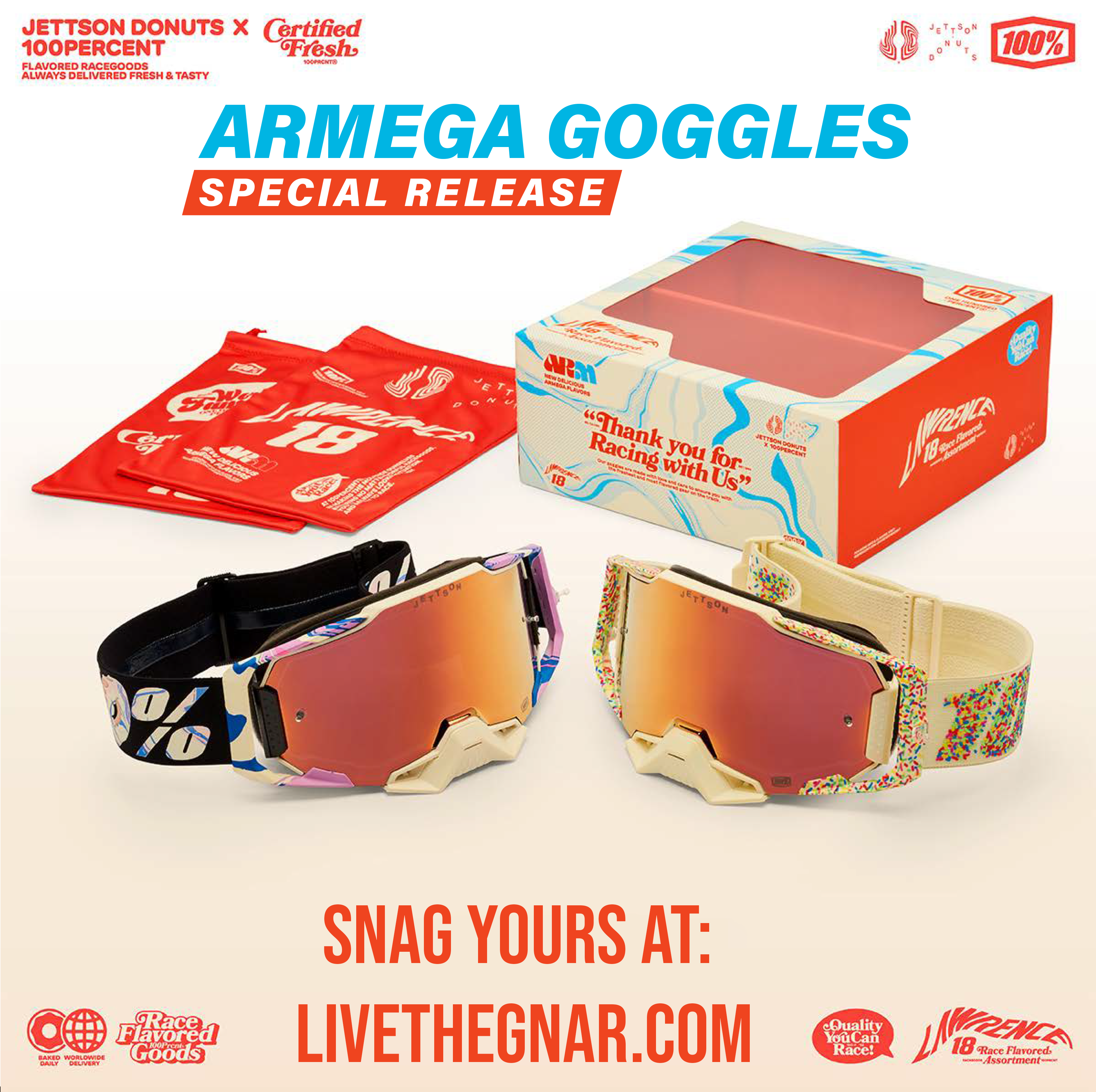 Snag these limited edition Jett Lawrence 100% Armega Goggles! 🍩