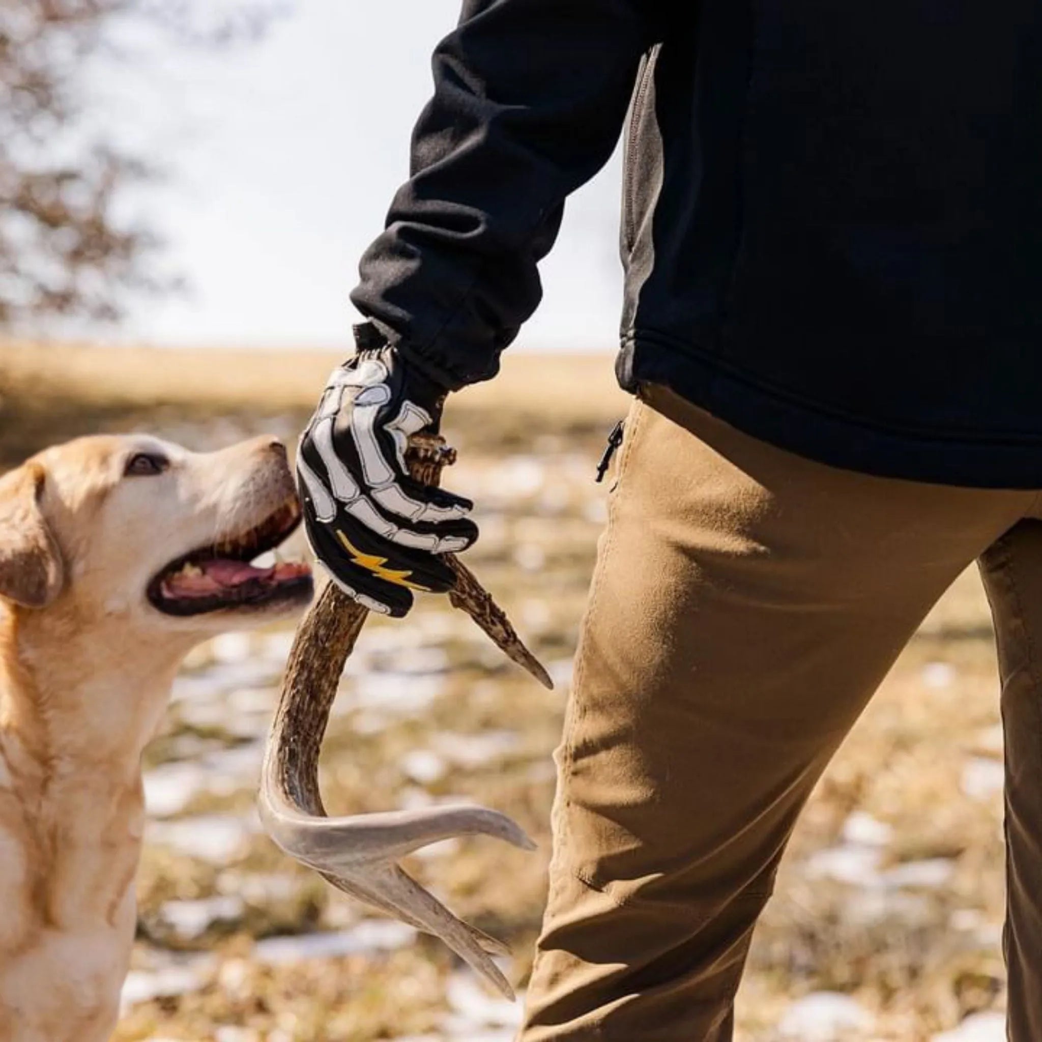 The Black Skeleton Astrapi, a blend of HANDCRAFTED ARTISTRY and ROBUST DURABILITY. Made from full grain Water Buffalo hide, this glove holds the promise of exceptional strength. The glove shapes to your hand, offering a CUSTOM-FIT COMFORT. It boasts a gold lightning bolt, meticulously hand-stitched with 40 pieces of buffalo leather, embodying the strength of astrapi (lightning in Greek). The index finger comes with a tech fabric for SMARTPHONE COMPAT