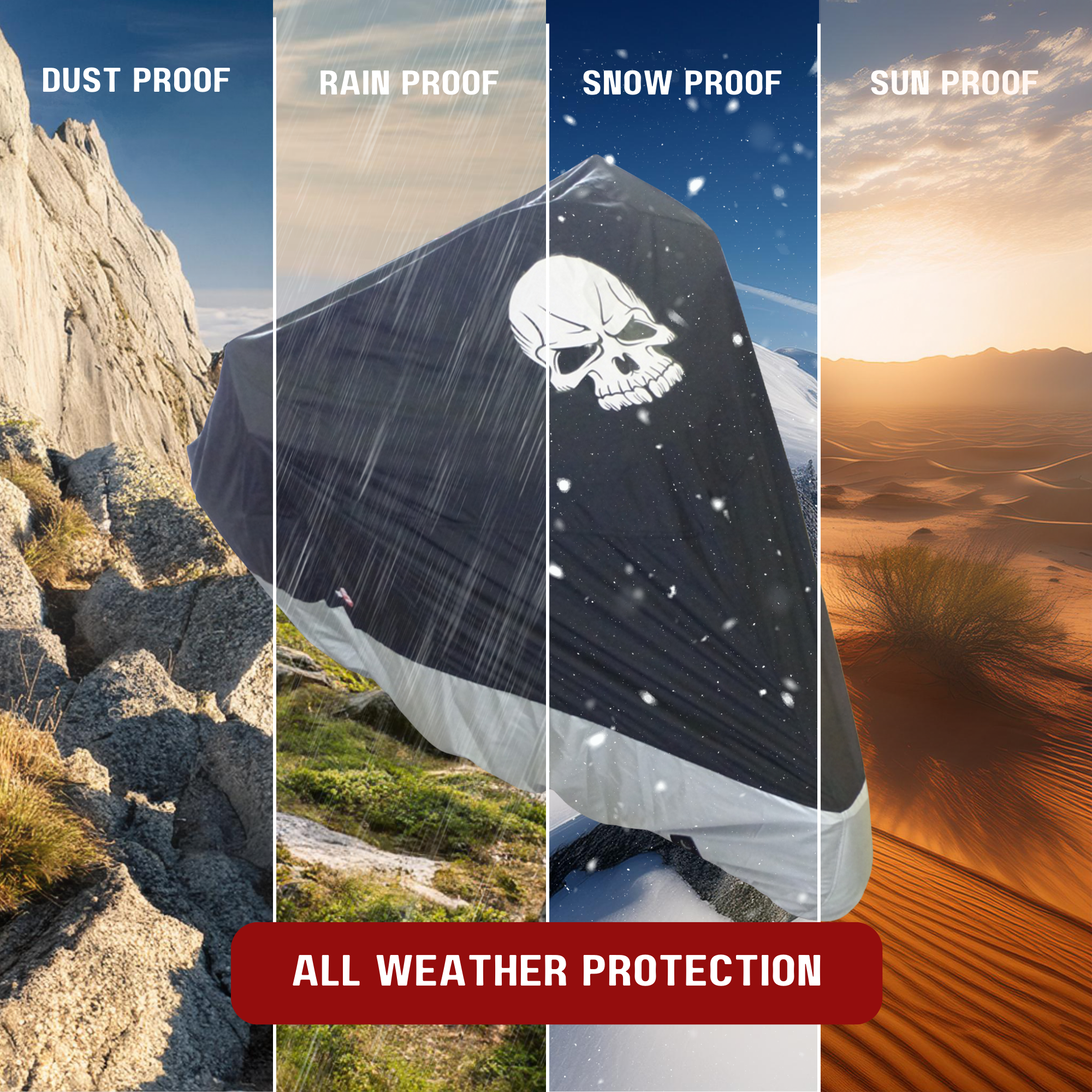 Need to protect your prized extra-large motorcycle? Our XXL Motorcycle Cover with Skull Logo is not only high quality, but it is lightweight and water resistant! Do you hate leaving your bike out in the harsh environment? If so, our motorcycle cover is the answer to your problems.