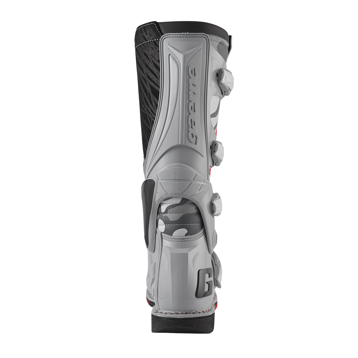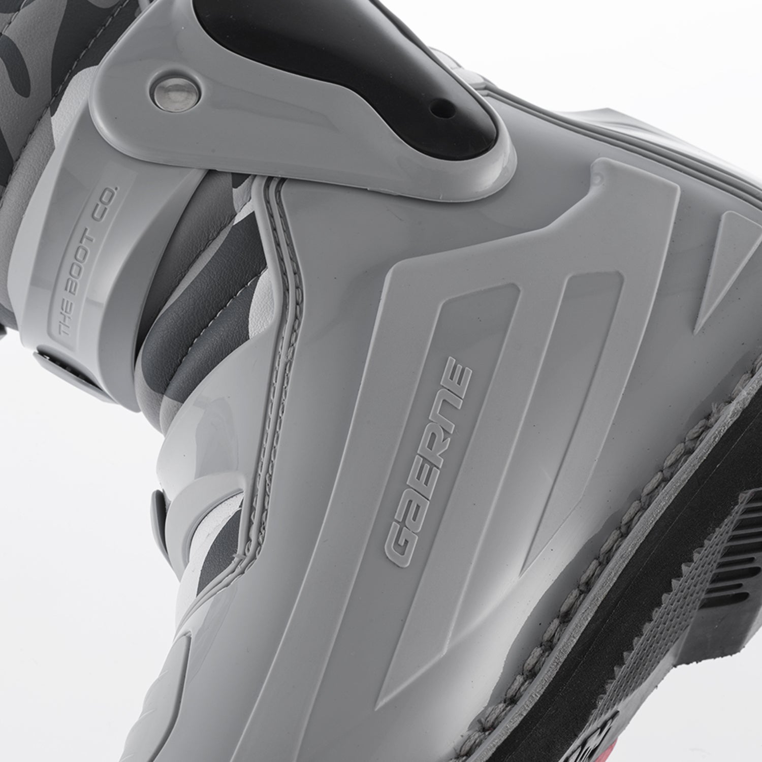 This innovative boot has a sleek new look. Partially due to the exclusive Gaerne *wrap around* ankle pivot system. This new, lightweight feature allows the rider more ankle support while at the same time gives you a comfortable fit. New alloy buckles, by removing the first two buckles on the top it is possible to make the opening wider to accommodate a bigger leg or knee-brace. Heavy duty burn guard, toe bumper and the trademark Gaerne *Enduro* sole complete the task.