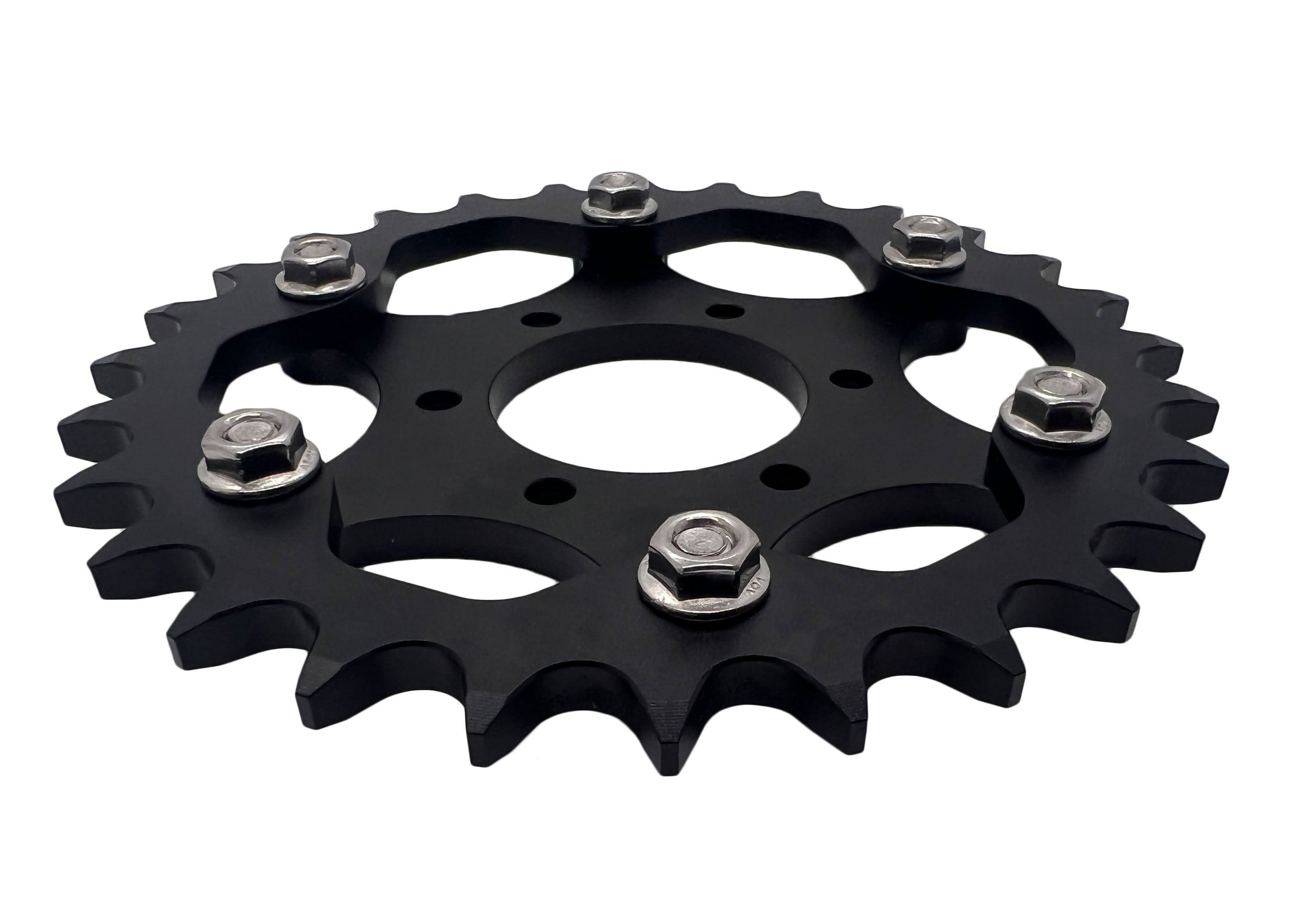 In addition to the chain size being upgraded, we have also designed an exclusive dished rear sprocket. The primary chain conversions with flat sprockets left very little room for the frame adjuster and rear lower motor mount frame tab. This will ultimately end up with damage and scarring to your frame if your tension goes slightly out of spec, so why not use the room provided and space it internally.