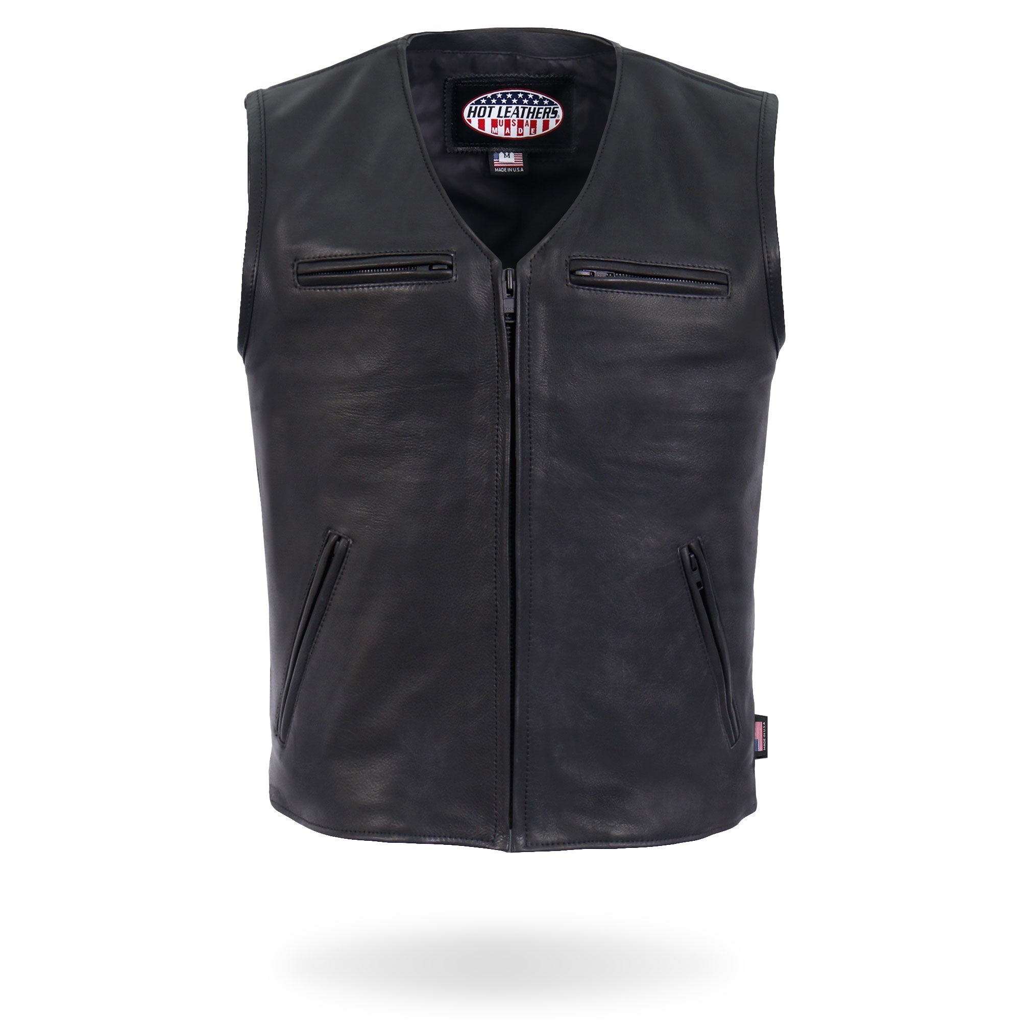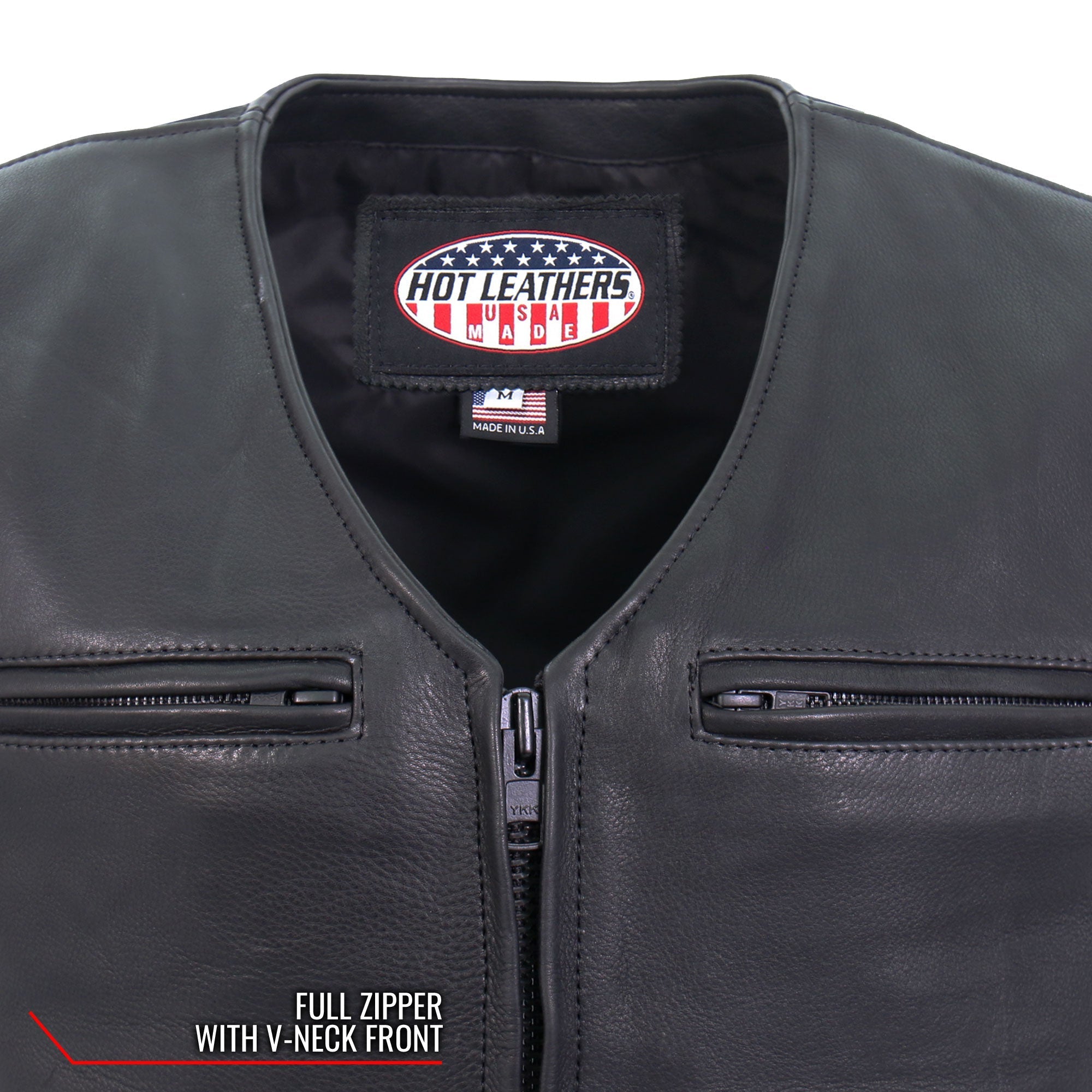 Hot Leathers Premium USA Made Leather V Neck Club Style Zipper Front Motorcycle Biker Vest