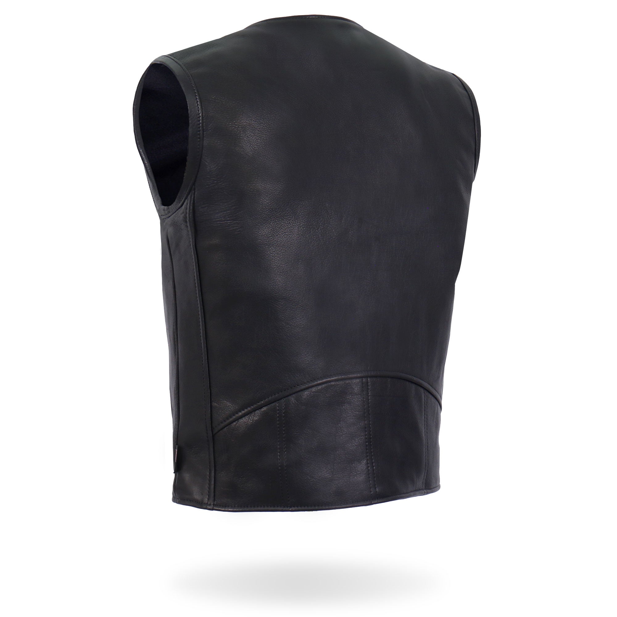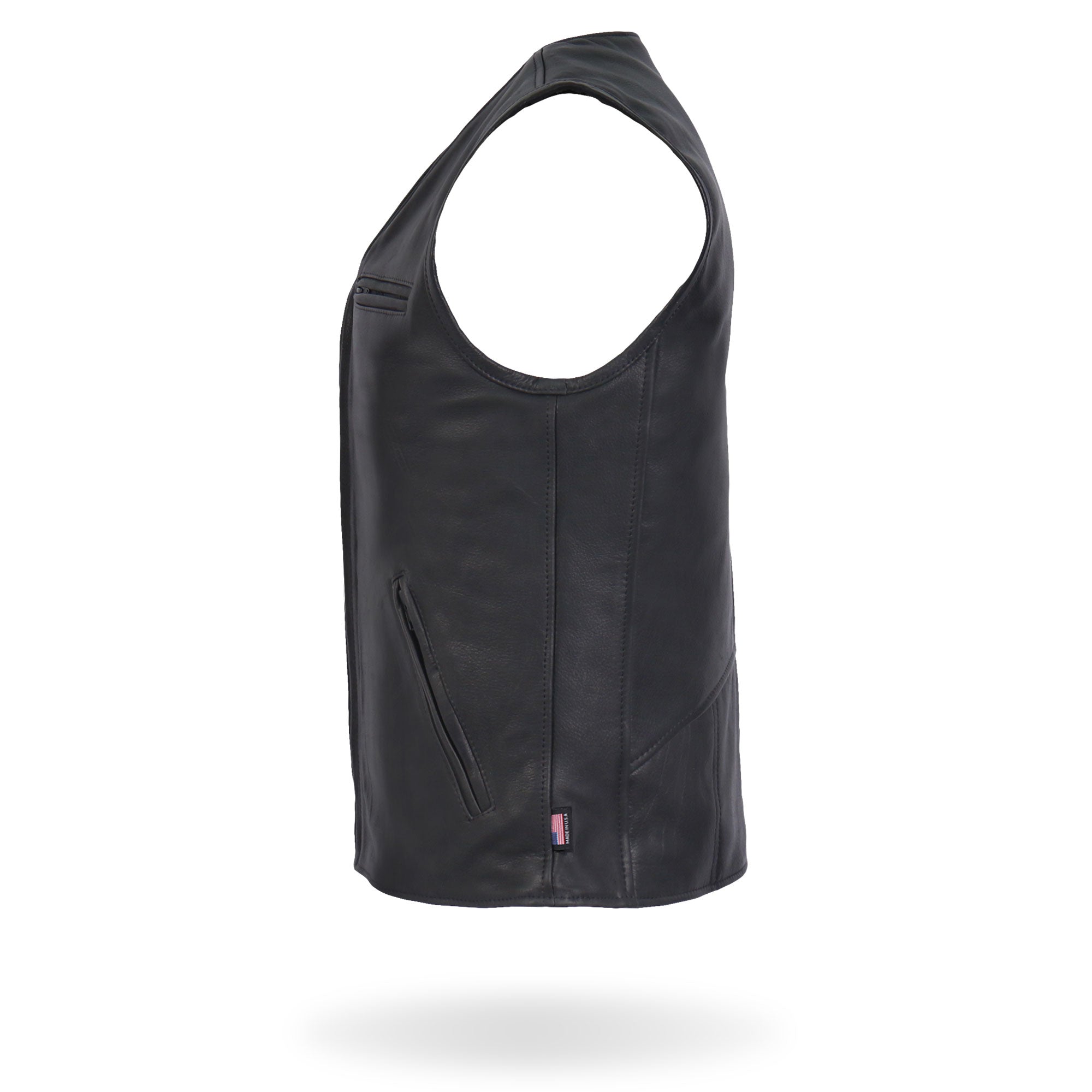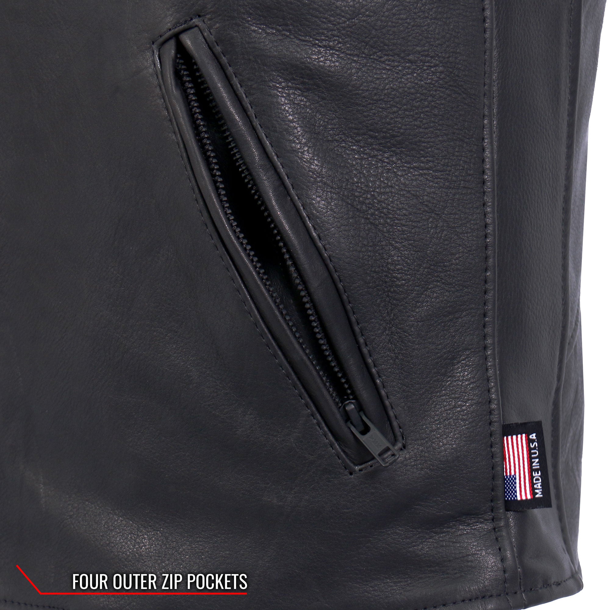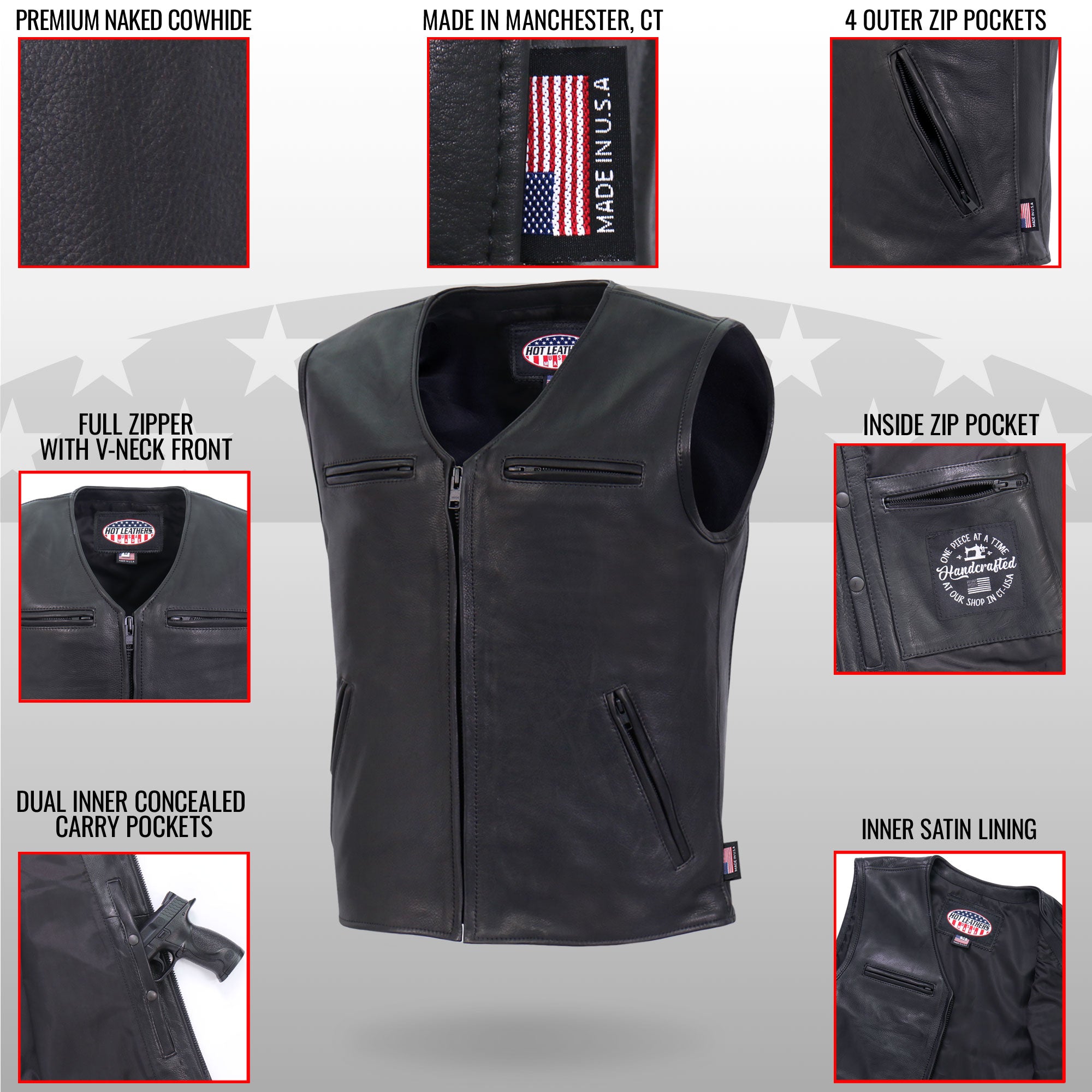 Hot Leathers all new American Made men's leather riding vest. All Hot Leathers USA Made vests are made in-house at our facility in CT. This vest is built using heavyweight naked cowhide. This Hot Leathers naked cowhide is super soft for that already broken in feel. It comes fully lined with a soft nylon lining. Outside, there are two outside YKK zippered pockets that are leather lined and two zippered chest pockets. Inside, you will find one extra deep carry conceal pocket and one zippered media storage pocket. This vest features a V-neck cut on the front for extra comfort. Fits great over your Hot Leathers flannel or hoody. All Hot Leathers USA Made Jacket, Chaps & Vest come with a 5 year Warranty.