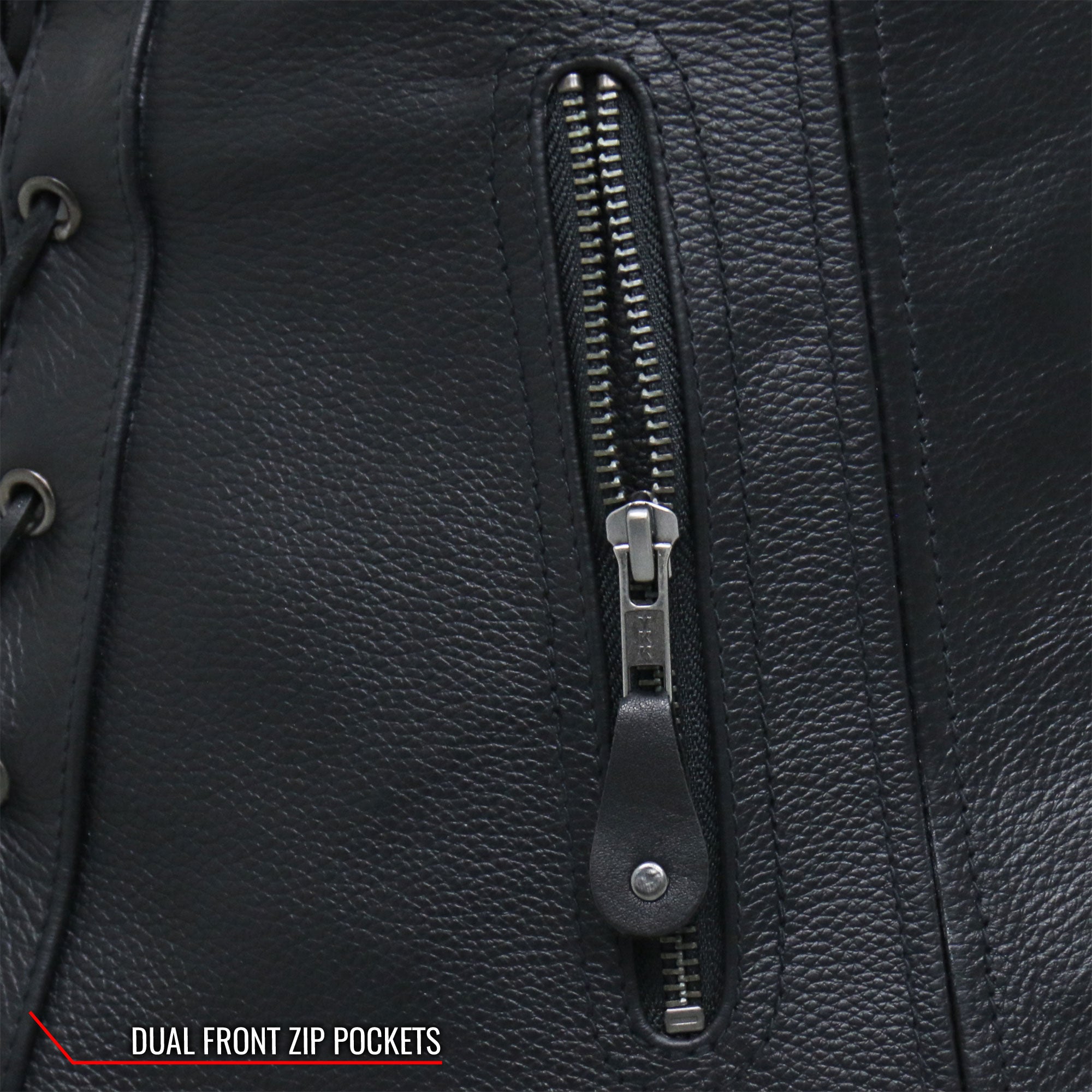 Hot Leathers new favorite ladies leather riding vest. This vest is built using naked cowhide and features a full zippered front with a YKK antique zipper. It has a tapered cut, lace up sides and fits great. There are two outside zippered pockets, one inside zippered pocket and one stash pocket.