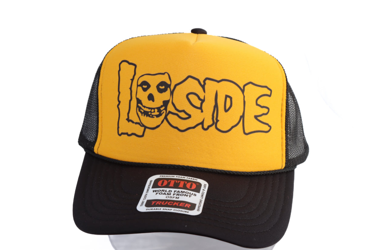 The LoSide Misfit Trucker Hat has a yellow panel front panel with black mesh back, printed in Oceanside CA.