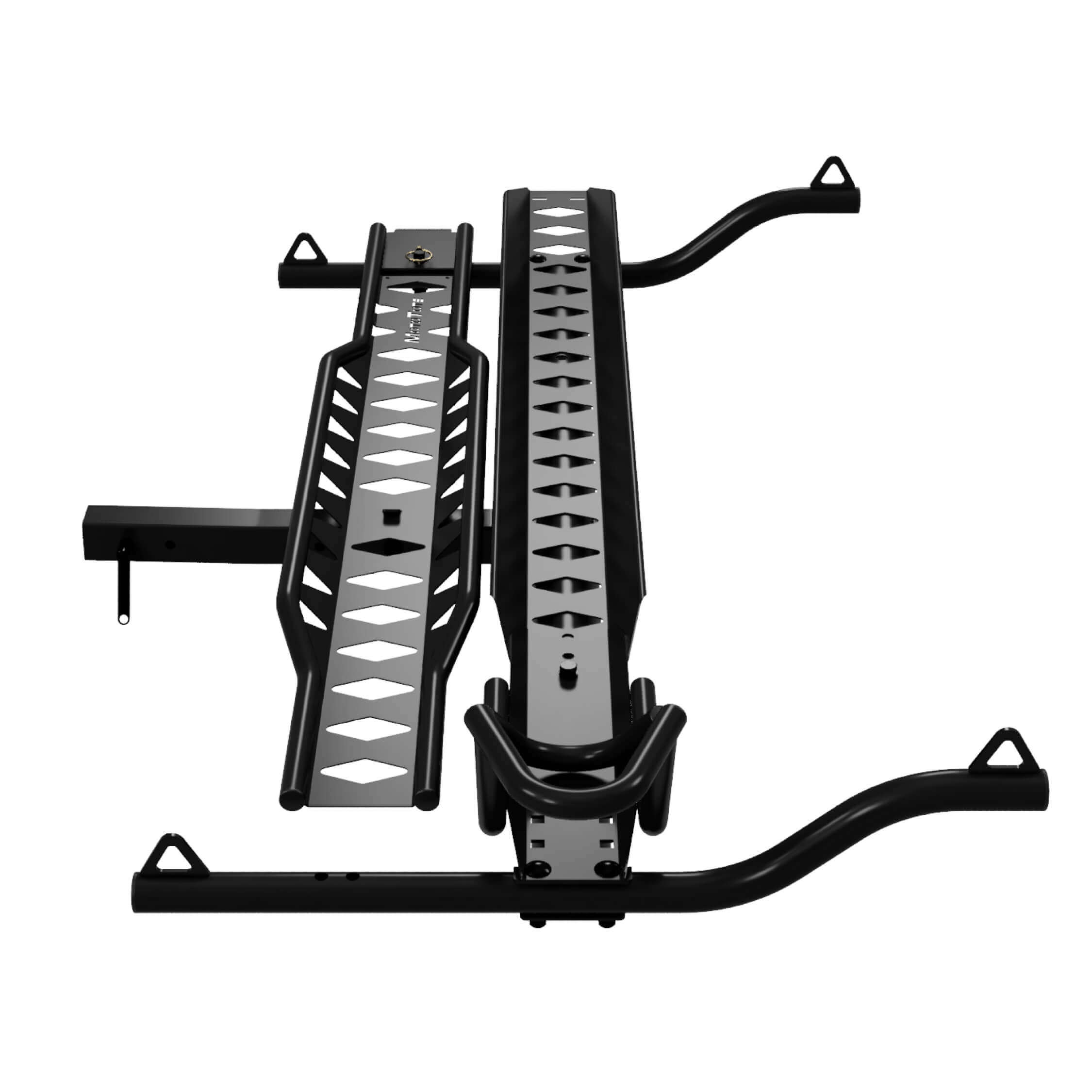 Innovative, lightweight, maximum-stability motorcycle carrier for standard-size tire motorcycles up to 600 lbs. (272 kg.); dirt bikes, scooters, and more. Made in Texas.