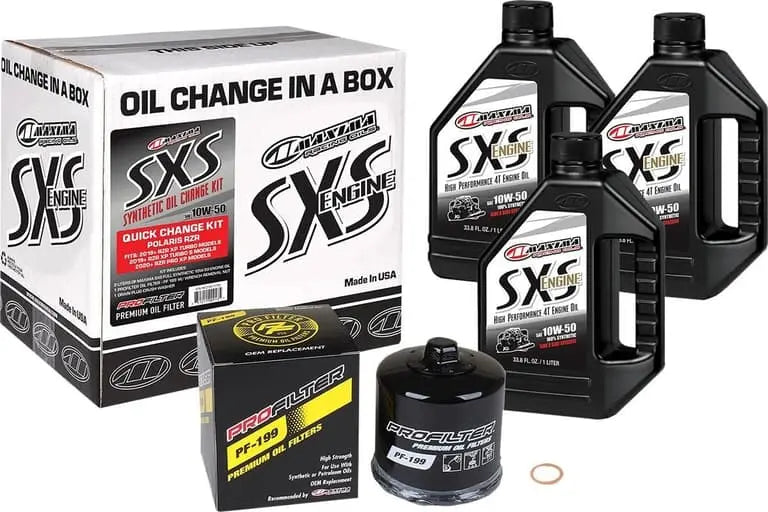 - Kit includes 3 1L bottles of Maxima SxS Full Synthetic Engine Oil, 1 ProFilter Oil Filter with wrench removal nut, and 1 Drain plug crush washer/o-ring to complete an engine oil change on your SXS