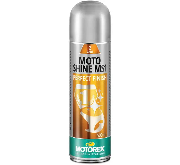 Motorex® Moto Shine MS1 is designed for the detailing touch after cleaning with a high-gloss formulation that protects and enhances fairings, plastics sets, dashboards and framework. MS1 provides a durable coating that repels mud and water when sprayed on a surface and left "wet" or leaves an additional anti-static film when allowed to "setup" then buffed to a long-lasting sheen. The perfect finish to looking factory fresh and staying cleaner longer.