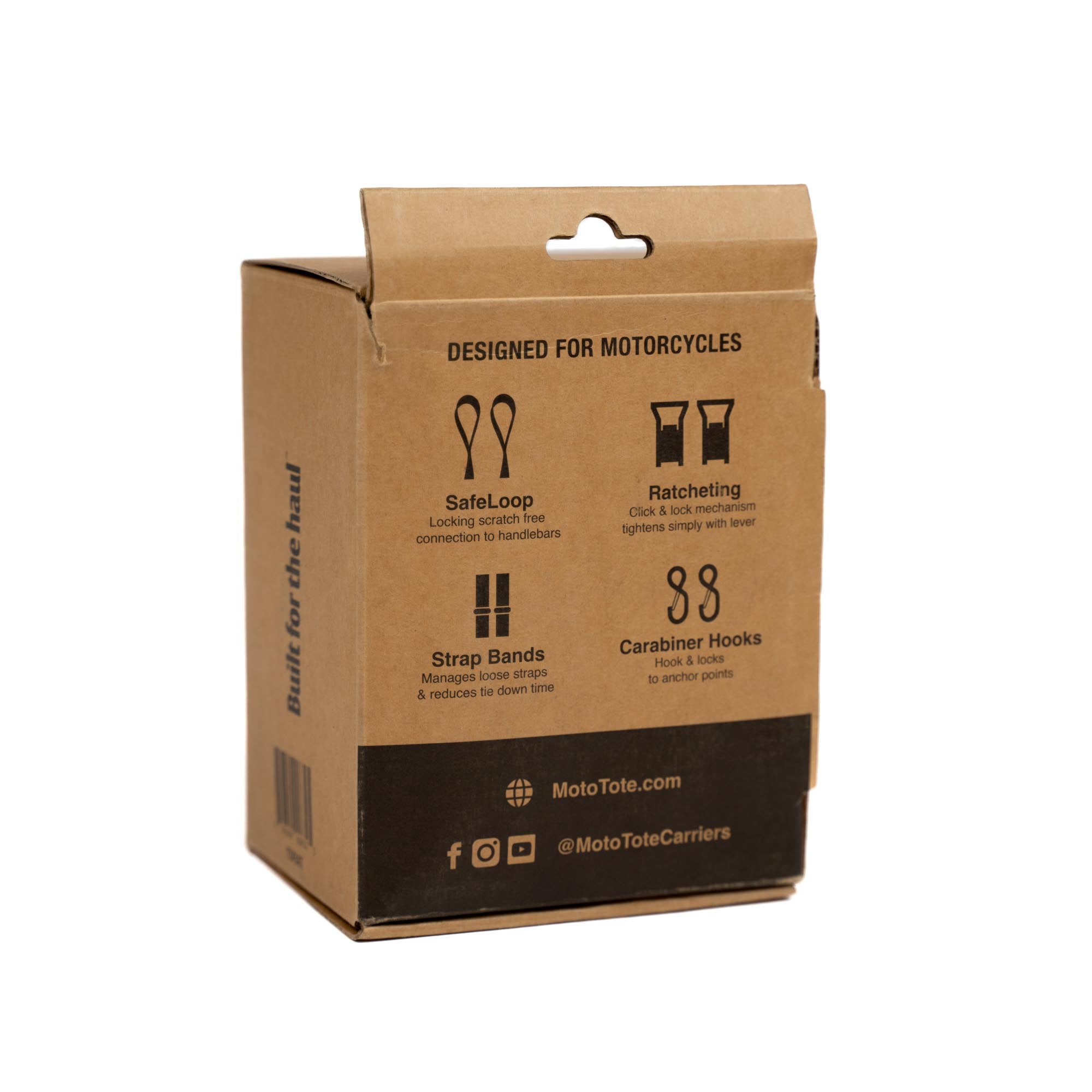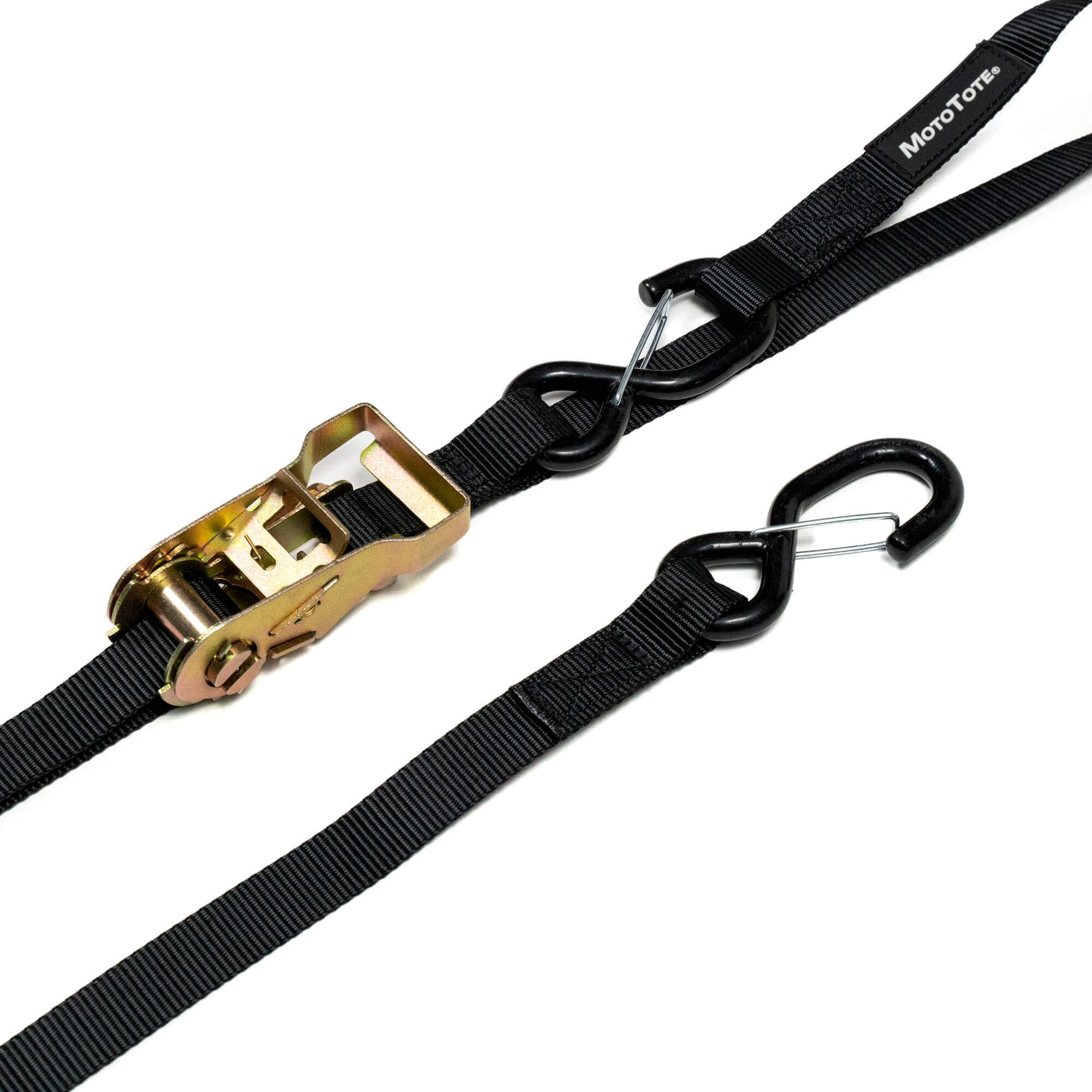 Locking, soft-loop motorcycle tie-downs with a ratcheting lever designed for motorcycle carriers with a 1,130 lb. working load limit.