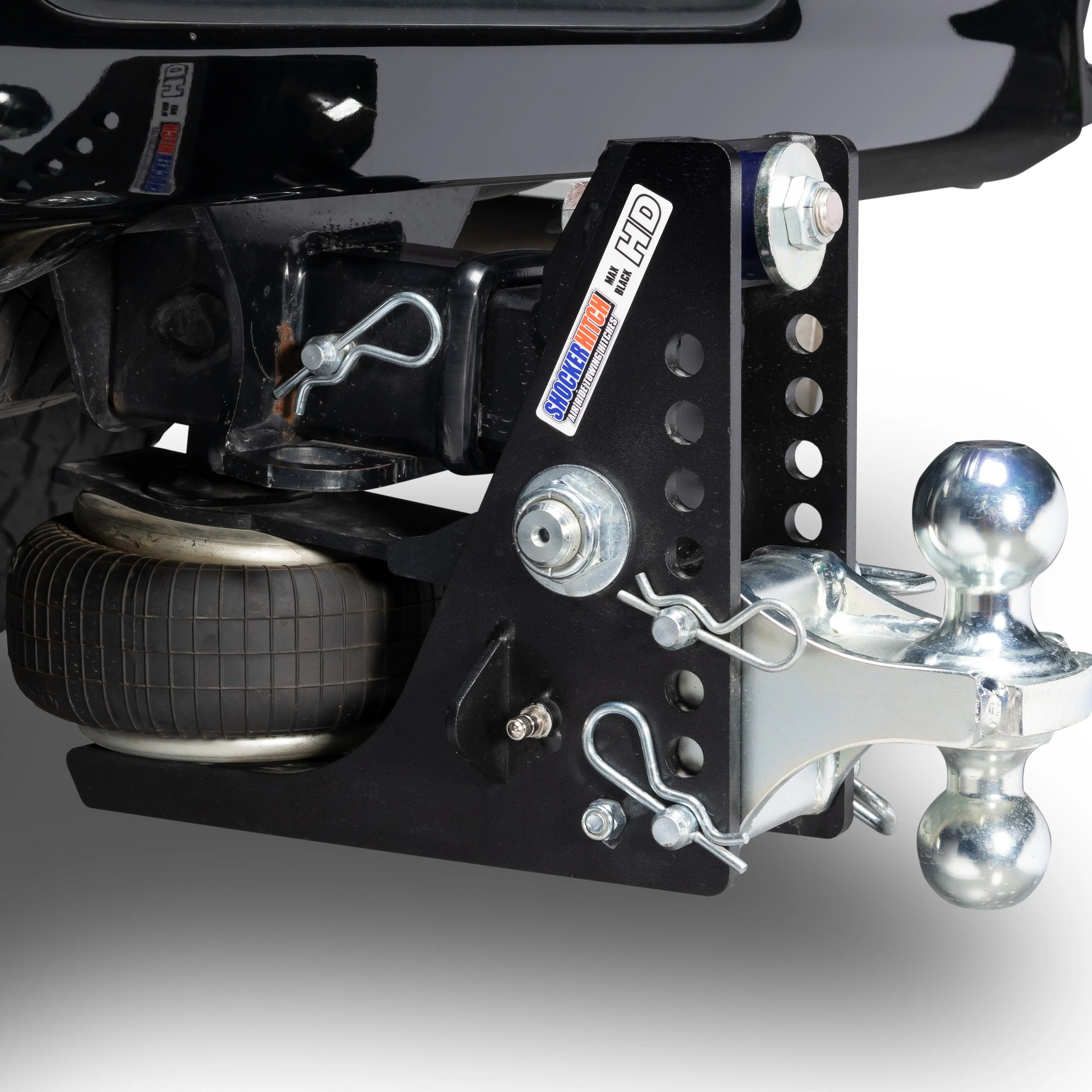 - Complete Kit Includes:Â Shocker HD Max Black receiver hitch base frame assembly with built in 20K air bag & dual bump cushions, ball mount you choose and two d-handle ball mount hitch pins.