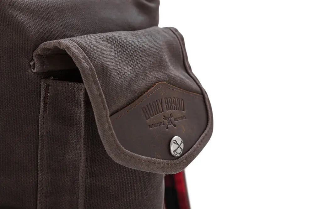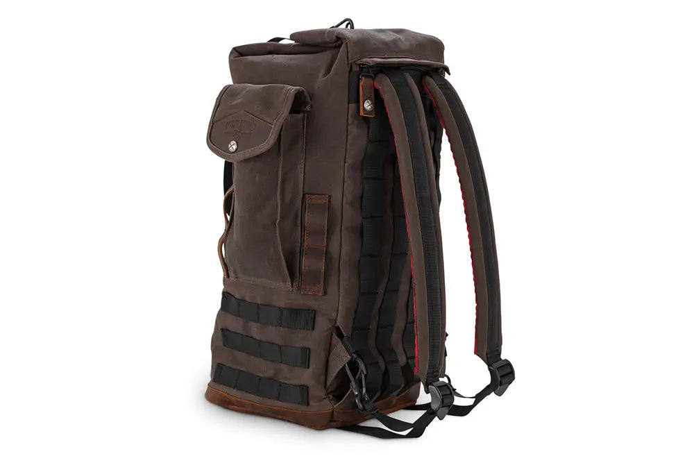 Burly Brand’s Sissy Bar Backpack is made of their proprietary Dark Oak Wet Waxed UV treated cotton canvas or Black CORDURA® and leather paneling for support that will age and show character over time. Three clever carry options with hidden Backpack straps, a leather wrapped side grab handle for easy duffel bag mobility and two tie-down straps secure the MOLLE system to most Sissy Bars. High quality “moto centric” zippers with metal Burly embossed button snaps and accents as well as an “Anti-Flail Snap System” keep everything secure.