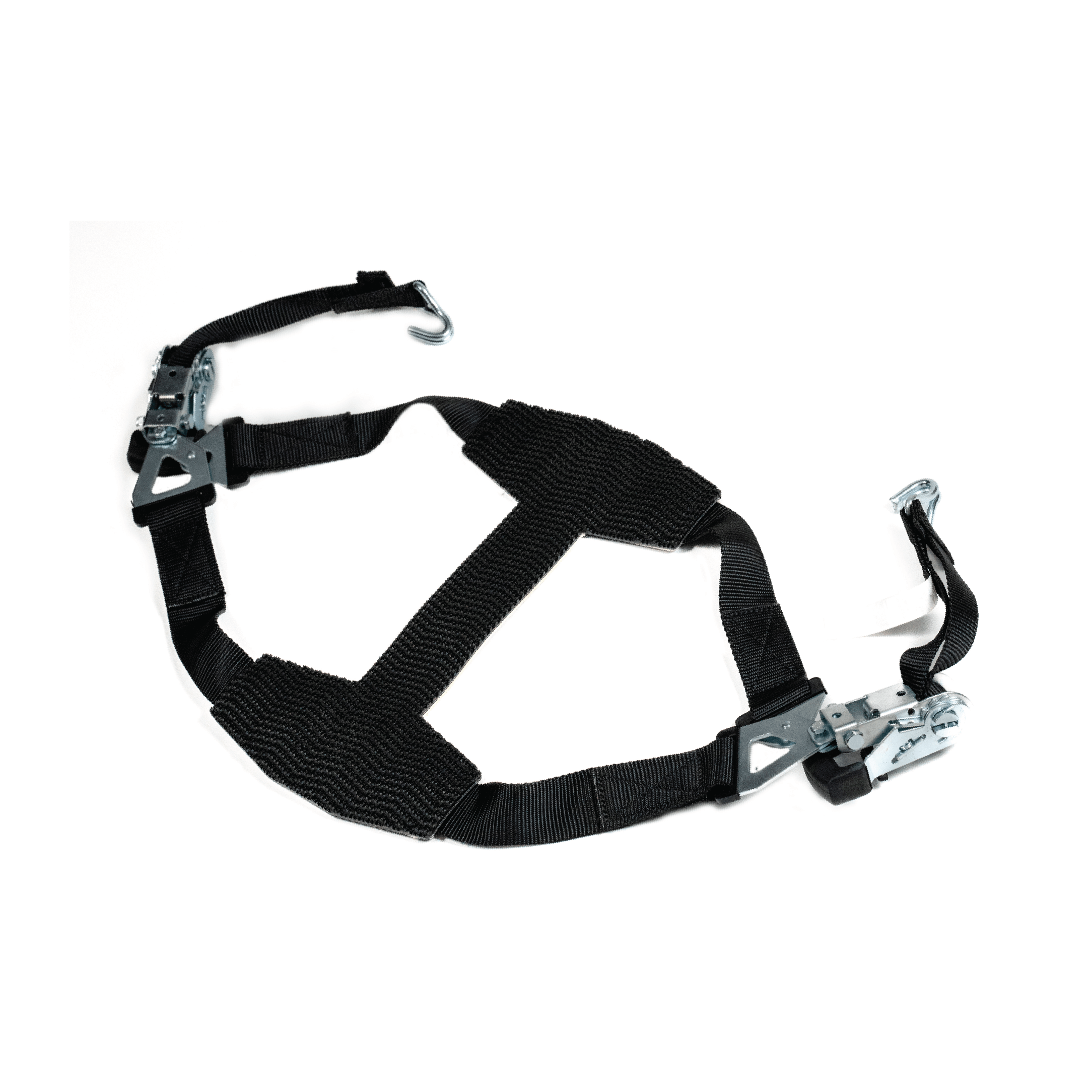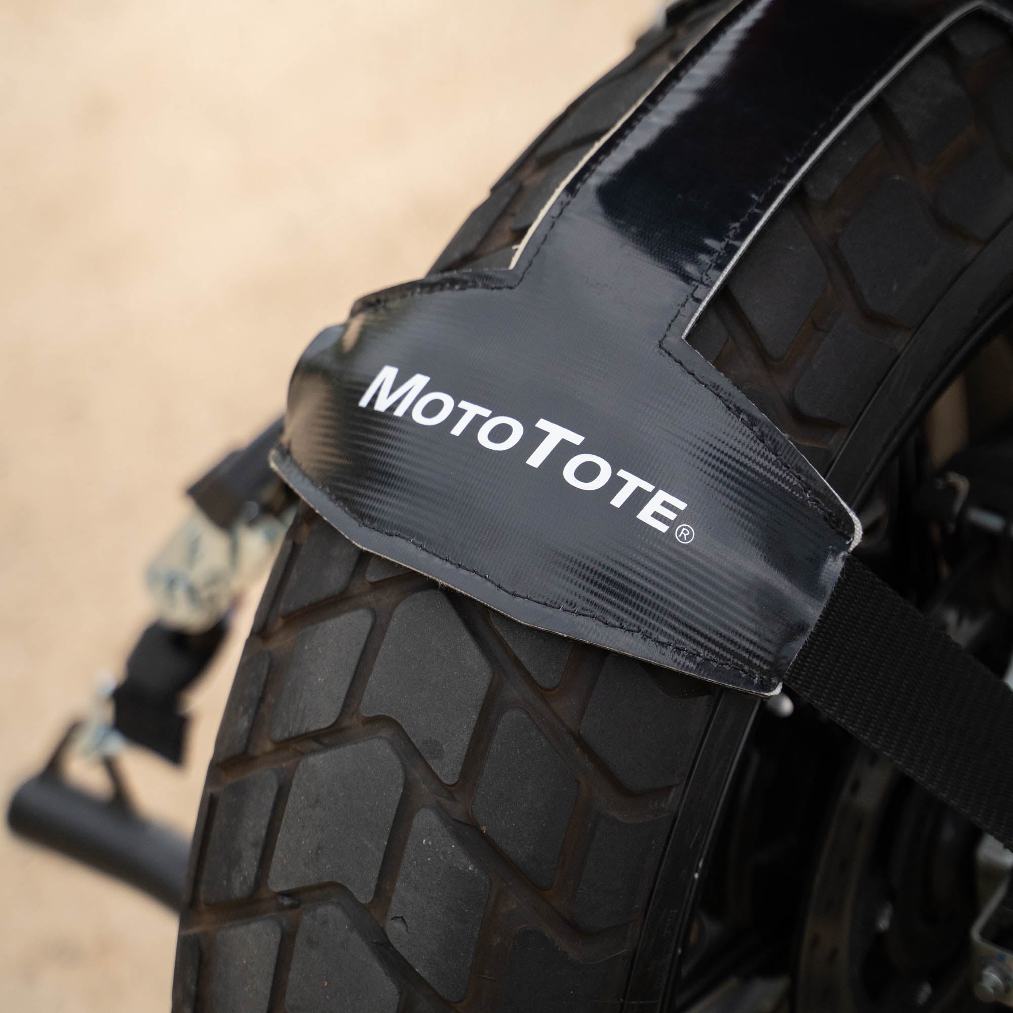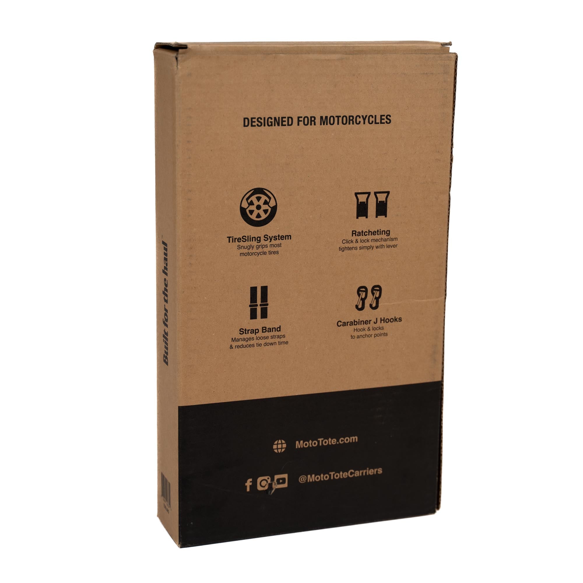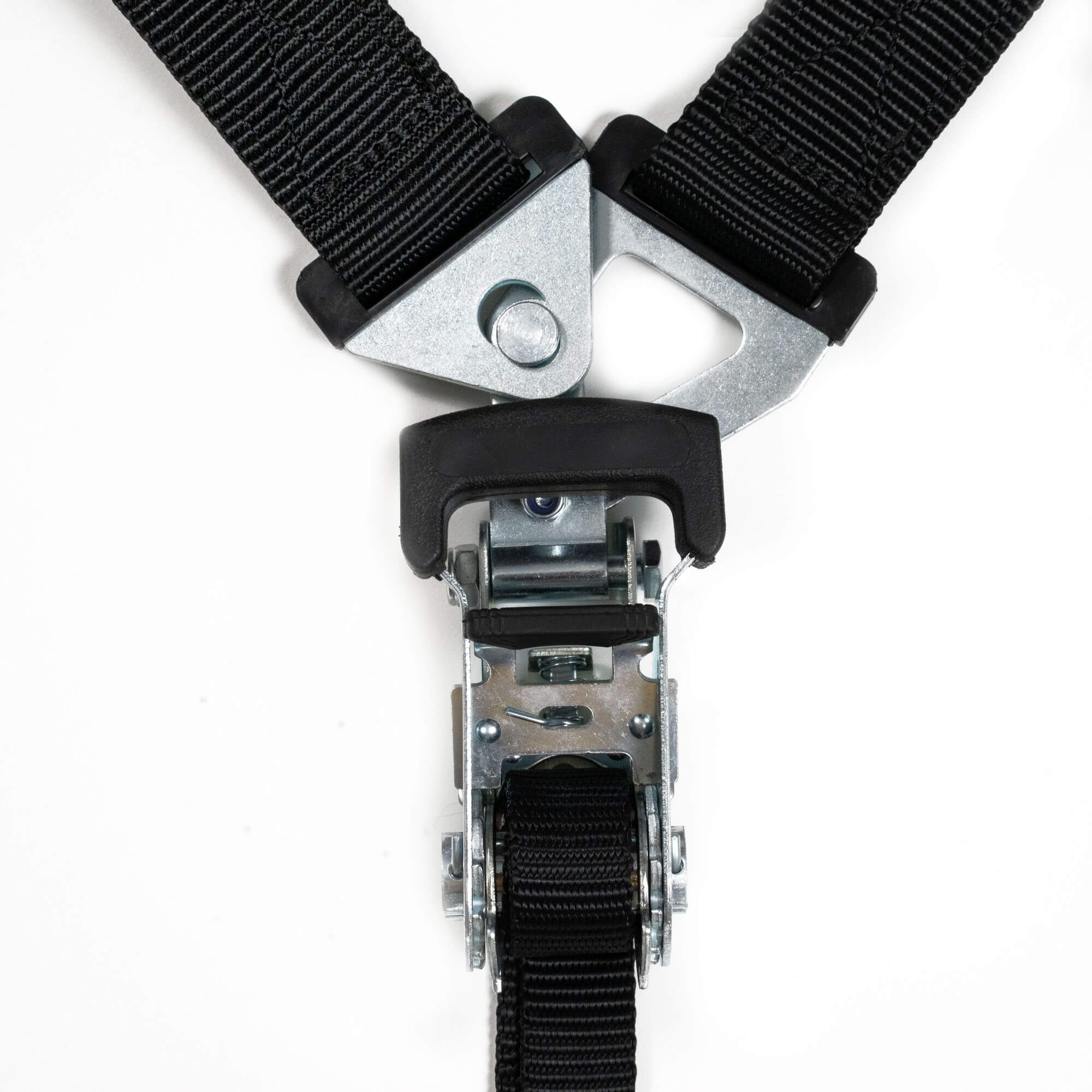 Heavy duty, maximum-stability tire tie down with a ratcheting lever designed for motorcycles with a 645 lb. working load limit.