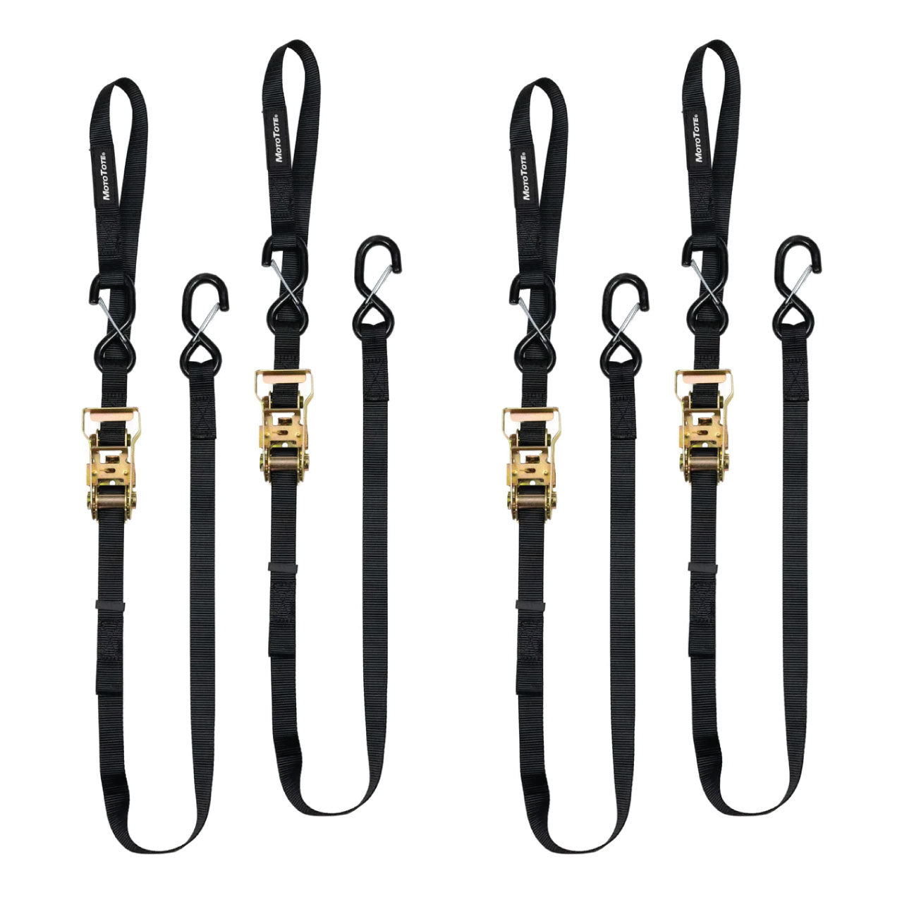 Versatile motorcycle tie-down bundle secures handlebars and rear tires with two pairs of soft loop, ratcheting tie-downs.