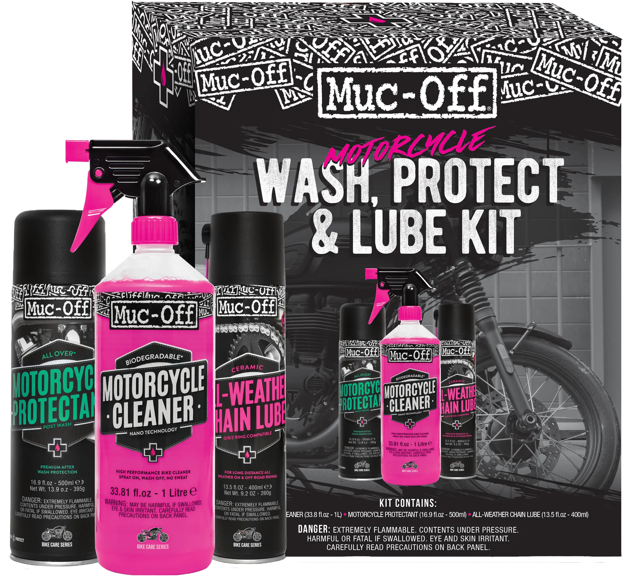 Get the best clean yet with the Muc-Off Bio Motorcycle Cleaner, it has an incredibly effective cleaning formula containing 'Nano Technology' that also cares for your motorcycles delicate finishes. It contains no harmful acids, CFCs or solvents and is fully biodegradable. Once sparkling, protect, preserve and freshen your motorbike with Motorcycle Protectant’s incredible water dispersing action. It has a high oil content so it is a perfect ‘all over’ after-wash corrosion inhibitor. Finally, apply the Muc-Off All Weather Chain Lube formulated to hold up to the extreme pressures that are applied to a motorcycle’s drive chain. It’s a highly versatile, all weather chain lubricant that has superior penetrative qualities ensuring that every part of the chain link is lubricated.